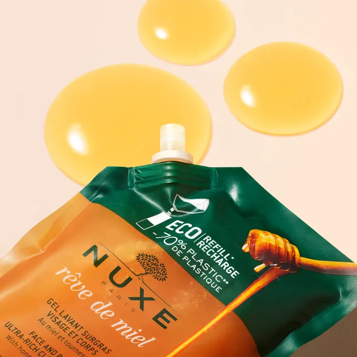 THE Nuxe Honey Dream Extra Rich Cleansing Gel in eco-refill format cleans, soothes and softens dry and sensitive skin.