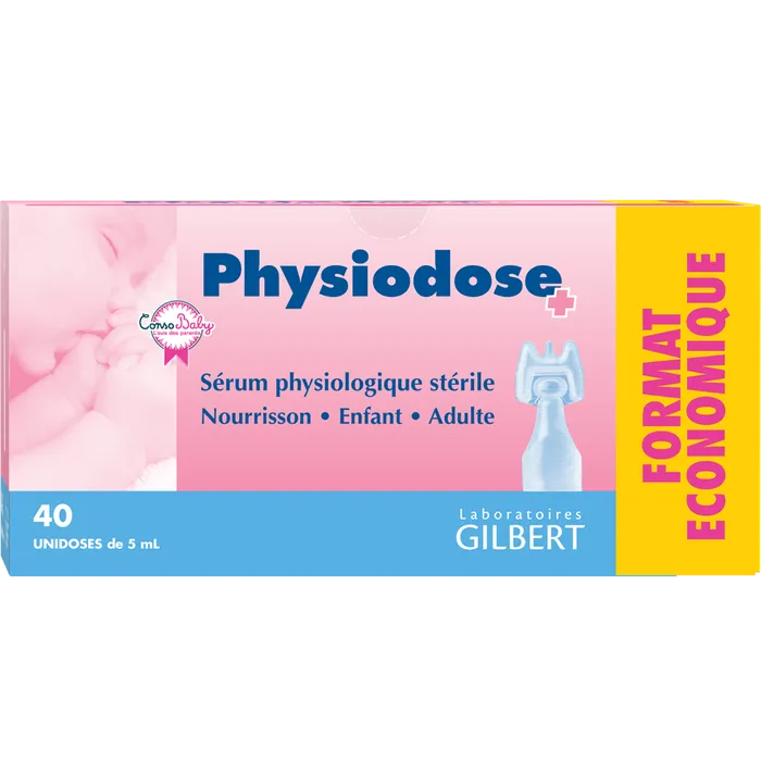 PHYSIODOSE physiological serum from GILBERT laboratories is recommended for cleaning the eyes, ears, nose and all sensitive or irritated areas of infants, children and adults.