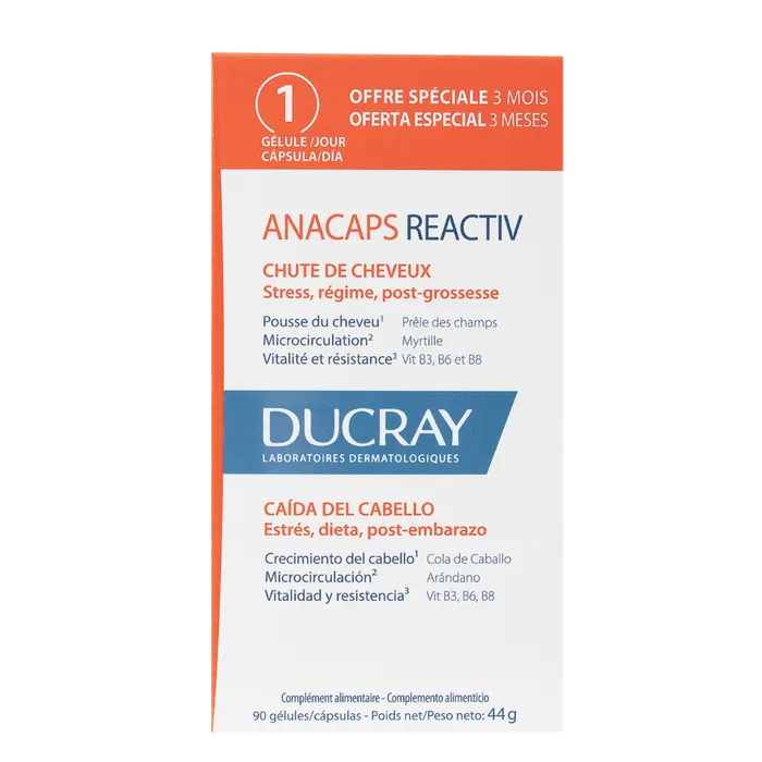 Les Compléments Alimenatires Anacaps Reactiv Ducray stimulent la pousse des cheveux et aide à les rendre plus fort dans le cadre d'une chute de cheveux occasionnelle et passagère.