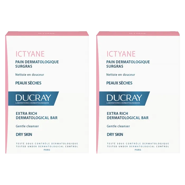 Ducray ICTYANE - Pain Dermatologique Surgras - Visage et Corps - Peaux Sèches, 2x100g